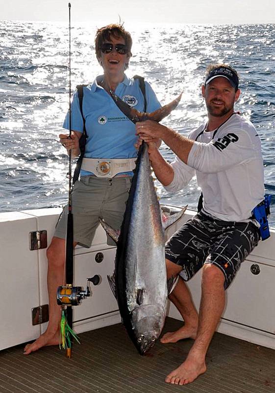 The marlin fishing for the tournament anglers was tough going. Some of the fleet opted to fished heavy tackle wide on the continental shelf for larger blue marlin and I think there was only one or two fish tagged. On the light tackle grounds in the shallower waters of the ‘trench’ again only a few smaller black marlin were tagged and a couple of sailfish also. Dr. Terry Russell, his daughter Anna Markey and crewman Daniel took out Champion Boat with two blacks and a nice Longtail Tuna.