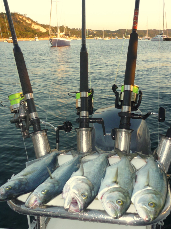I also took advantage of the conditions and the opportunity to catch up with a few mates onboard my little Salt Shaker III. Saturday was one of those great days with the wind backing off late morning and turning east in the afternoon, providing near glass out conditions. With the radio skeds from the tournament reporting very little activity on the marlin fishing front, I opted to do some spinning under Cape Moreton and found plenty of trevally on offer, and some chopper tailor along the back of the surf break at Yellow Patch. Of course with the big swell still running you had to keep your wits about you and watch out for the set waves when in close!