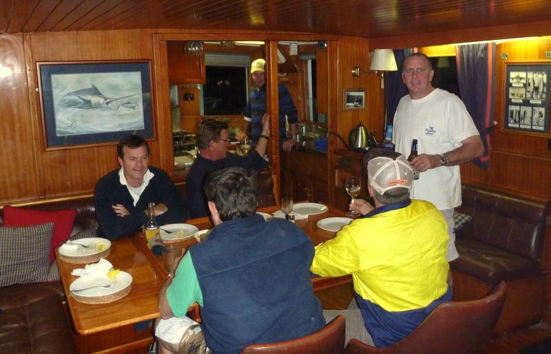 This years trip departed on the Wednesday evening and we returned Friday. The forecast held true with 5 to 10 knots of ENE Wednesday evening allowing us to anchor on the ledge west of Cowan Cowan to fish the 11pm turn of the tide. The fishing was very quiet but the trip across the bay was flat calm, in contrast to the atmosphere in the saloon as the boys enjoyed the first State of Origion on the big screen.