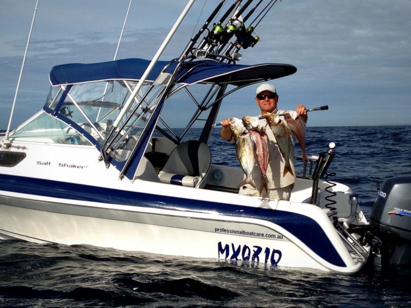 It was only a month or so ago, during the transition of seasons, that we were complaining about the lack of fish both offshore and in the bay. Well things have improved as I keep receiving good reports from the Gold Coast to Mooloolaba. Even I managed to sneak out for a solo run in Salt Shaker III last Friday and got a feed early of Amberjack, Squire and Spangled Emperor. Over the last few days a couple of Professional Boat Care clients have had their boats down at the Gold Coast with some mates and have been having some great fishing. The new Grady White 36′ has been christened with some nice fish as highlighted in the shots below (click to enlarge).